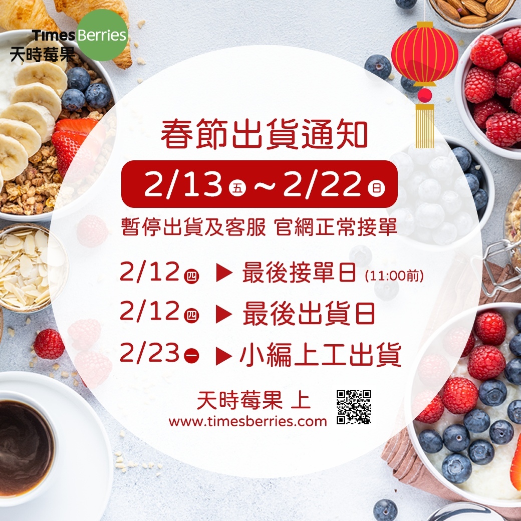 🔸2/12(四) 上午11點前最後接單日 🔸2/12(四) 最後出貨日 🔸2/23(一) 開工上班出貨 祝您2026年火馬騰雲,好運降臨🐴 常吃莓果讓您活力滿滿💪💪