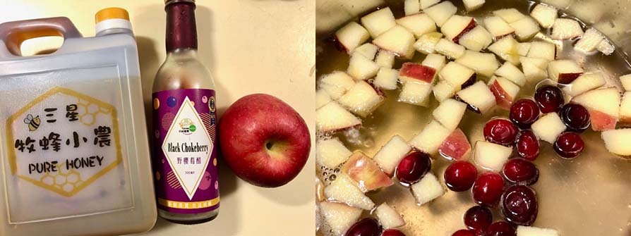 🍴 材料:華盛頓富士蘋果1/2顆、冷凍蔓越莓1.5大匙、純蜂蜜2小匙、野櫻莓果醋1小匙、水500CC