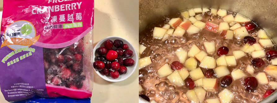 6.水滾起再把蘋果丁(先用撈勺瀝乾)跟冷凍蔓越莓加進鍋中,蓋鍋煮3分鐘。把熱呼呼的蘋果茶倒進乾淨的茶壺裡,完成。