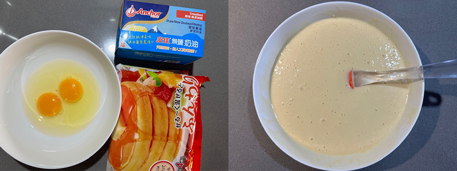 1.雞蛋洗淨先打在要和麵糊的碗裡;鬆餅粉買方便習慣吃的即可;奶油烤鬆餅時增加酥脆口感用。