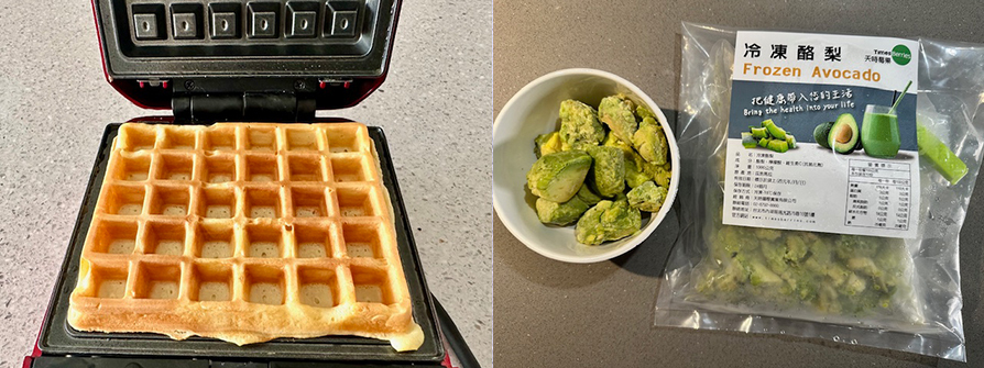 6.烤鬆餅的時間,從冷凍取出早餐好朋友:冷凍酪梨塊放碗裡讓他退冰變軟,用湯匙壓成酪梨泥方便搭格子鬆餅沾著吃。