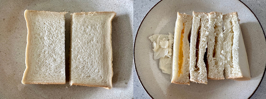 ※吐司要挖成口袋,用厚片吐司才好挖成口袋。