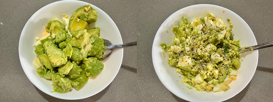 6.用湯匙前緣切碎攪拌在一起,灑上黑胡椒粒、鹽提味拌勻,就完成酪梨蛋沙拉囉。
