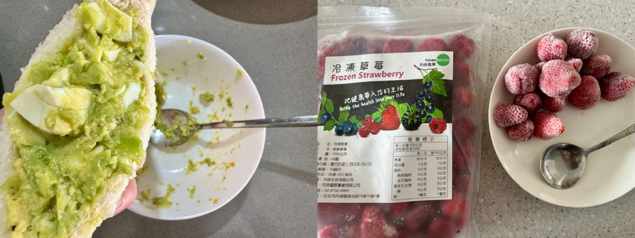 厚片吐司2片、酪梨200克、雞蛋2顆、黑胡椒粒1/3小匙、鹽1/4小匙、冷凍藍莓5大匙、冷凍草莓20顆