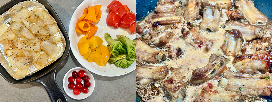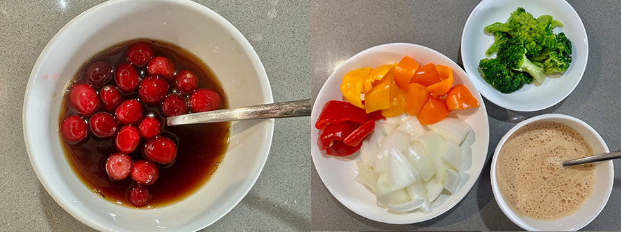 洋蔥1/2顆、紅甜椒/黃甜椒(小型)3顆、青花菜1/5顆、天時冷凍蔓越莓1大匙