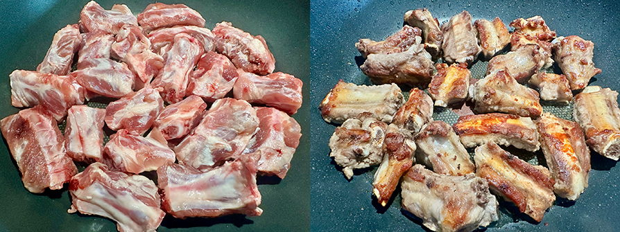 5.鍋小火加1大匙油,均勻擺好排骨,設定計時器蓋鍋煎6分鐘。