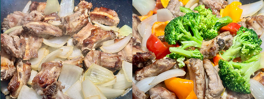 8.洋蔥炒出甜味了再把剩下的配菜(青花菜、甜椒)加進來翻炒,蓋鍋蒸炒3分鐘後翻炒一下讓味道再次融和,先熄火。