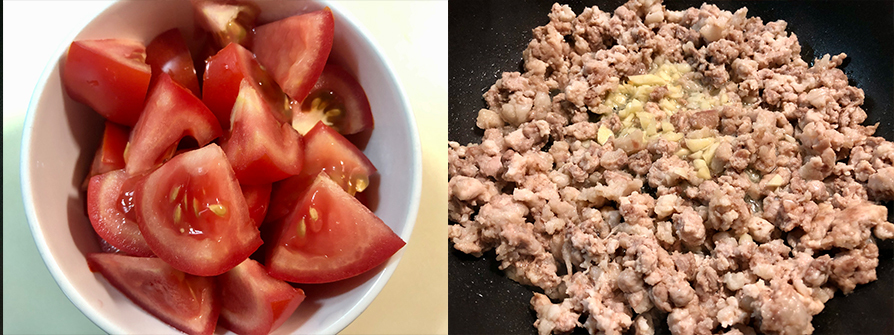 2.●煸香絞肉的時間處理配菜,小蕃茄季節過了,牛蕃茄剝掉蒂頭洗淨,先順紋理對半剖,再切4舟再橫切塊。