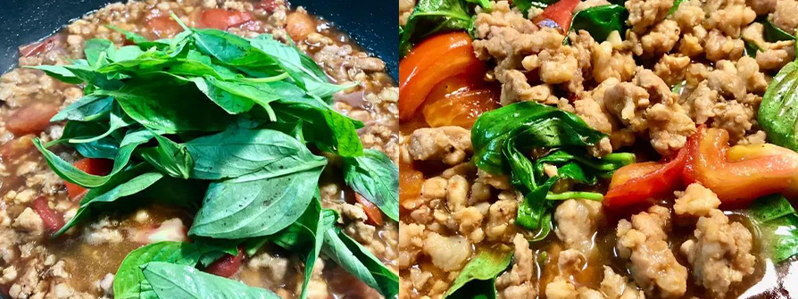 9.●九層塔剪掉梗留葉子口感才好,洗淨瀝乾,最後加進鍋中翻拌。
