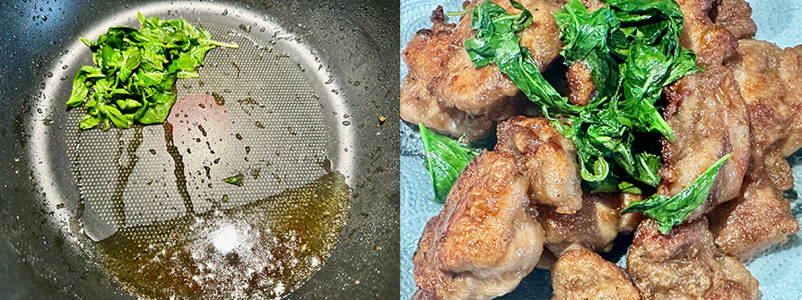 5.用煎炸完雞肉的原油原鍋,夾出雞肉後,先熄火,再把九層塔葉放進來後蓋鍋防噴濺,把鍋傾斜讓九層塔瀝油後夾出。