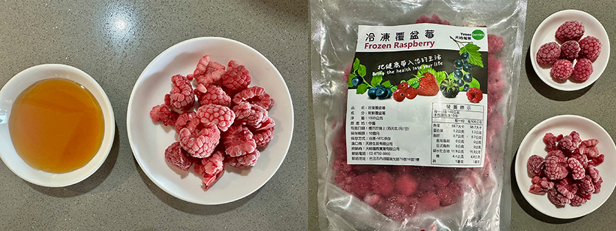 天時冷凍覆盆莓2大匙、蜂蜜3/4大匙、冷開水1.5大匙