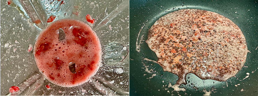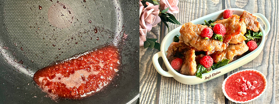 10.用煎炸完雞肉原鍋把油用廚房紙巾擦拭乾淨,將打碎的莓果醬汁倒進鍋中,開小火熬煮,莓果有果膠熬煮過果膠釋出很適合當沾醬。