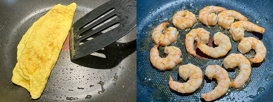 6.用煎蛋原鍋維持小火再放1小匙油潤,把蝦倒進鍋中煎2分鐘,放第一隻按下計時器放完剛好2分鐘,2分鐘到再從第一隻蝦用筷子幫翻身,全部翻完約1分鐘,熄火完成。