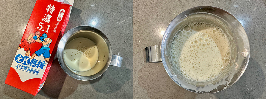 倒250cc豆漿在奶泡杯裡,開始練手臂,打成奶泡,單層奶泡杯壓100下奶泡可以維持很久。