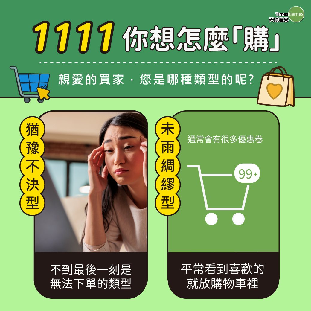 雙11即將到來,大家對自己的慾望清單已經準備⬇️手了嗎? 莓寶整理幾種常見的購物類型,來看看您是屬於哪一型買家吧🤗!~ ps.購物之餘,也別忘記來點花青素照顧一下身體喔!💪🏻 ❤️ 莓好雙11,睛彩花青素✨ 活動時間:即日起-11.14 15:00 🎉全家滿1111免運 🎉1000g莓果任選3包93折(不含有機莓果) 👉🏻立即選購