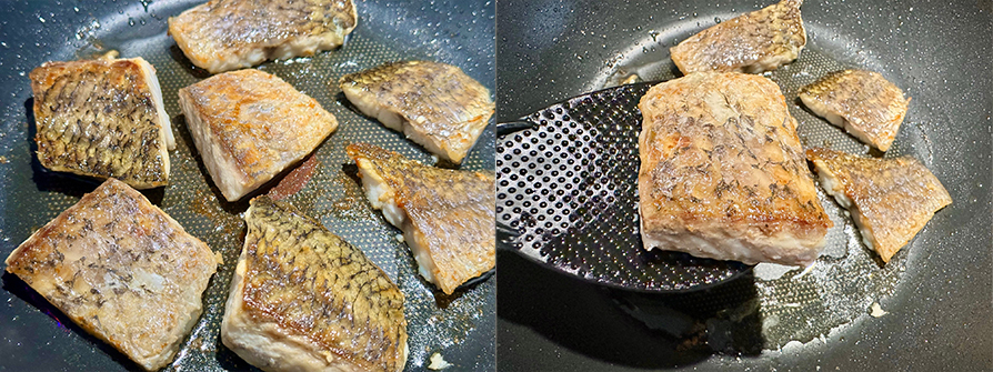 4.計時器響了,用飯匙小心將魚片翻面後煎1分鐘,鍋中火不關從較薄的魚片逐一盛盤。