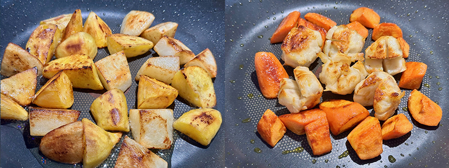●馬鈴薯/地瓜/紅蘿蔔刷洗乾淨,刨皮切滾刀塊,盡量切均勻大小,煎的時候較好一起熟。
