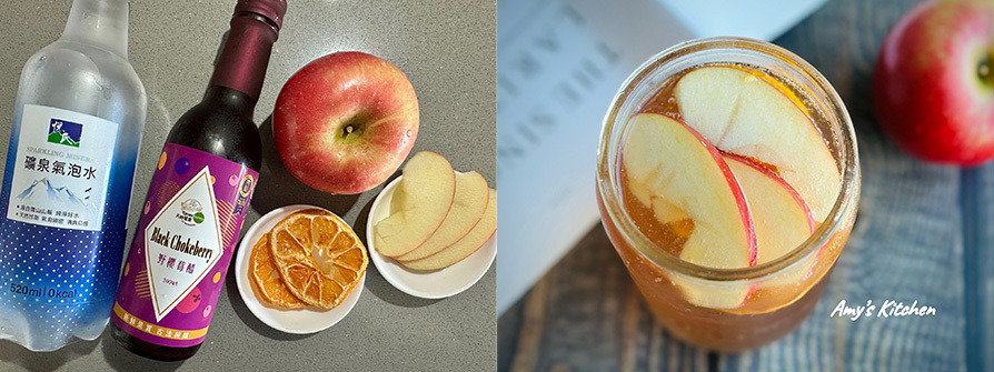 華盛頓加拉蘋果1/4顆、氣泡水520毫升、野櫻莓果醋2大匙、甜橘果乾2片