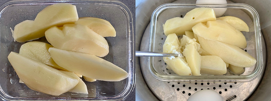 2.蛋洗退冰過也放在蒸盤上跟馬鈴薯一起蒸熟,電鍋外鍋120CC水蒸至電鍋跳起,用筷子搓馬鈴薯塊能輕鬆穿透馬鈴薯就熟了。