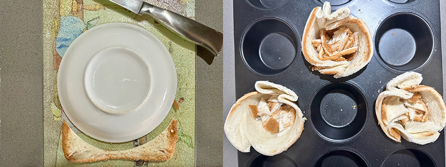 8.把壓過的吐司貼平瑪芬模,邊邊可略摺喜歡的小摺,烤起來能有獨一無二的吐司杯型,再把步驟8裁下來的吐司邊撕碎放在杯底,這樣襯底能讓吐司杯底裝上薯泥後保持乾爽。