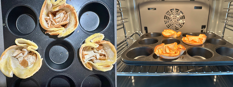 這也很適合當聚會點心,吐司杯全部烤好再挖上薯泥加上盤飾,黑白大廚競賽畫面浮現,哈哈。