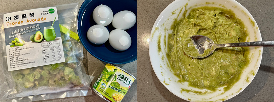 3.易開罐玉米粒開罐後倒掉罐裡的水,倒進酪梨泥碗裡。