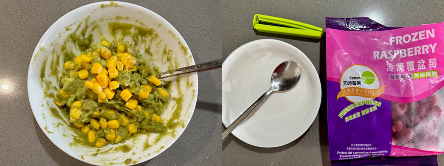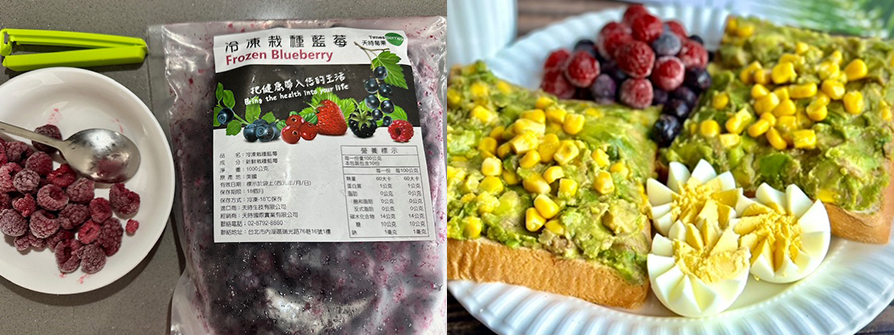 冷凍酪梨300克、吐司4片、雞蛋4顆、玉米粒1罐、冷凍覆盆莓4大匙、冷凍藍莓4大匙