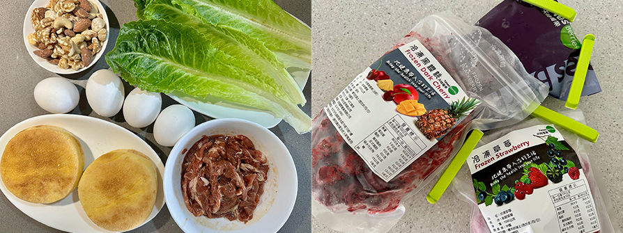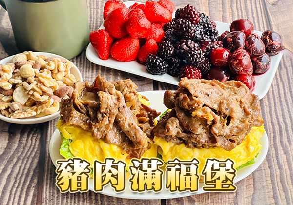 滿福堡麵包2個、梅花豬肉片6片、雞蛋4顆、無調味堅果3大匙、台灣蘿蔓4葉、冷凍黑眉4大匙、冷凍草莓12顆、冷凍黑櫻桃12顆、酪梨油3小匙