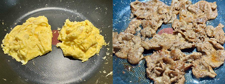 6.燒肉的做法:用煎蛋的原鍋再補1小匙油維持小火,將煎好的肉片均勻鋪好,豬肉變色後就翻面,這樣不厚的梅花豬肉片就煎好了。(小火煎肉能讓肉嫩不柴)
