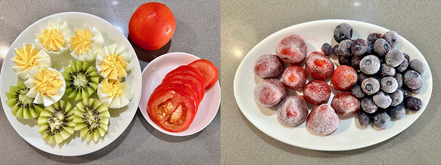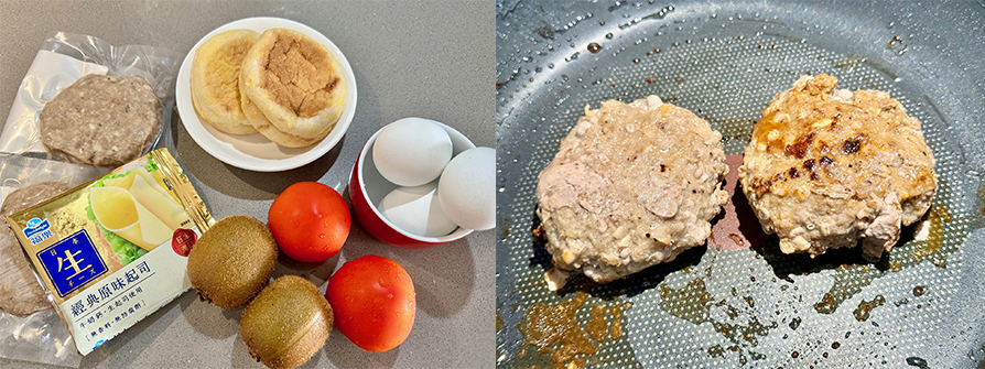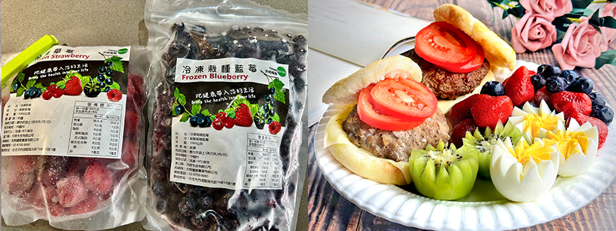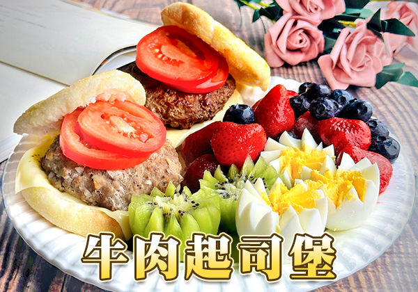 和牛漢堡排2片、滿福堡2個、起司片2片、雞蛋3顆、奇異果2顆、牛番茄1顆、天時冷凍藍莓4大匙、天時冷凍草莓10顆