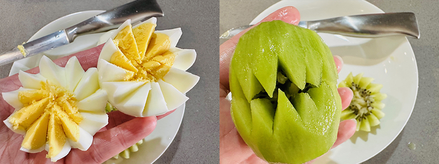 來點餐桌美學蛋剝殻後,左手蛋右手拿小刀,在蛋的肚子中間劃一圈山字,就如照片這樣囉,不一定要這樣切,整顆吃或切片也可。