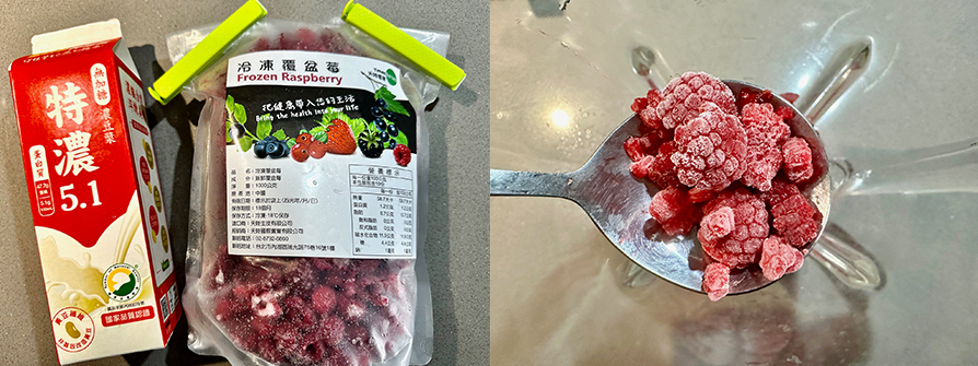 1.備料很簡單,豆漿選自己喜歡的,冷凍莓果分享食譜是常客,各種喜歡的冷凍莓果都備在冷凍庫,沒吃水果就用莓果補齊當日五蔬果。