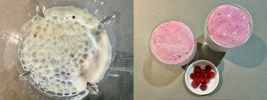 3.用果汁機把豆漿跟覆盆莓打成汁。