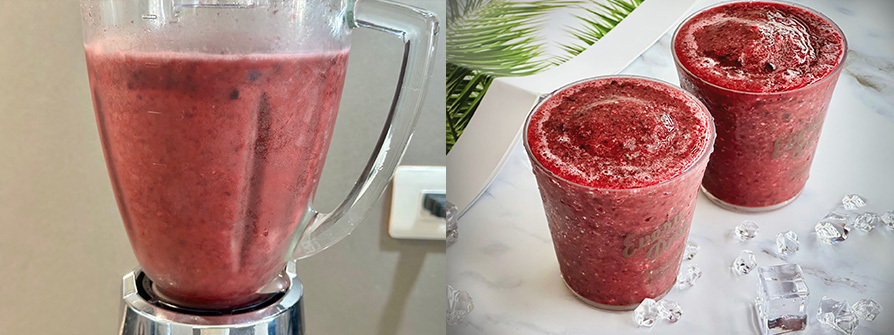 2.冰沙跟莓果精力湯的差異在,用水的比例控制口感,莓果們全部倒進果汁機裡,加進可飲用冷開水及蜂蜜。