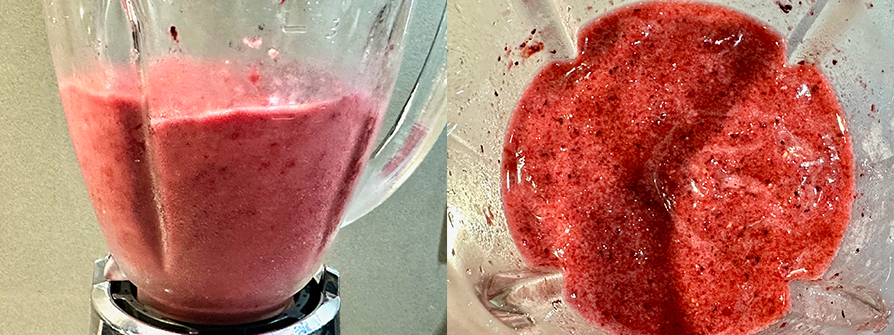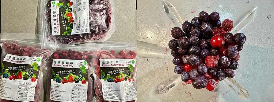 2.可以依自己的喜好調配冷凍莓果使用的比例,把冷凍莓果全部放到果汁機裡加100 CC冷開水。