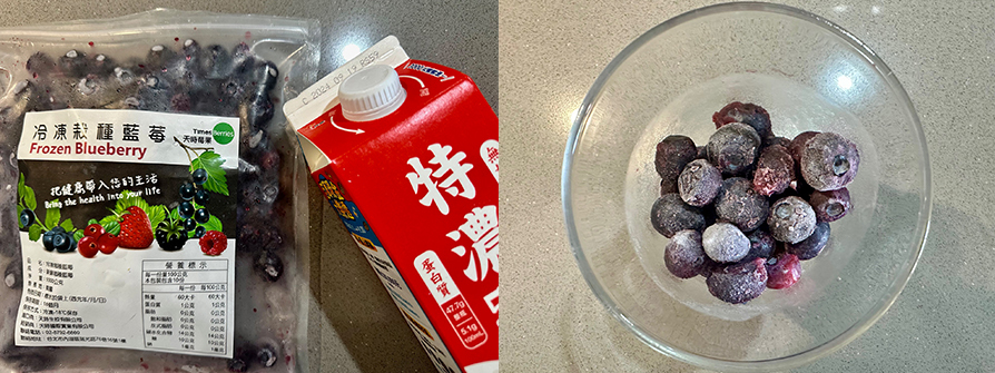 1.簡單的早餐引材料就這兩樣,冷凍藍莓跟喜歡的豆漿。