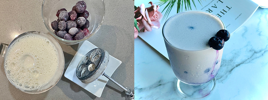 3.豆漿倒進奶泡杯裡,拉壓成奶泡,將奶泡倒進裝有冷凍藍莓的玻璃杯裡,不用一分鐘,躺平完成。