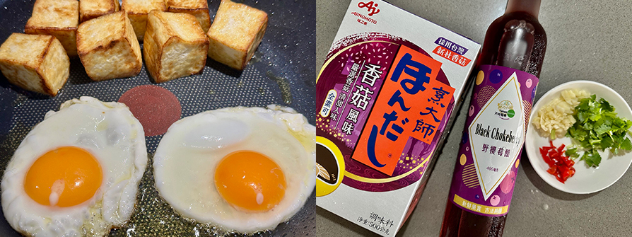 5.鍋再補1小匙油,把豆腐推到鍋邊繼續煎,換煎蛋若沒有習慣吃蛋可以省略煎蛋步驟,豆腐各面共再煎4分鐘每面金黃完成。