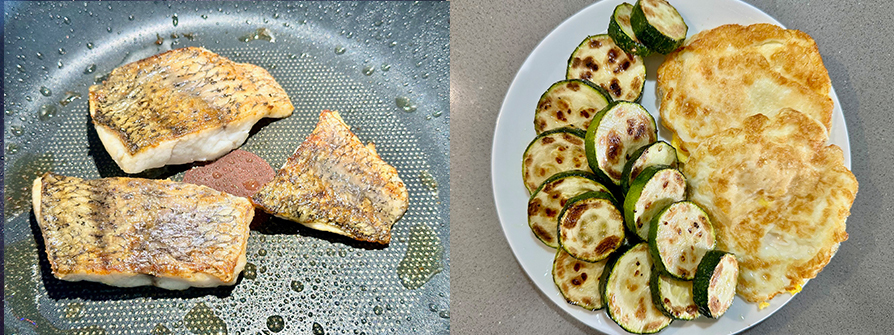 6.用煎櫛瓜原鍋小火再補1小匙油,魚皮面朝鍋底,設定計時器蓋鍋煎6分鐘,翻面再蓋鍋煎1分鐘,熄火,完成。