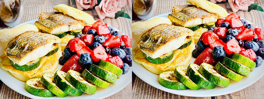 滿福堡2個、金目鱸魚排1片、櫛瓜1條、雞蛋2顆、鹽1/2小匙、黑胡椒粒1/3小匙、酪梨油2小匙、天時冷凍黑醋栗1大匙、天時冷凍藍莓3大匙、天時冷凍草莓14顆