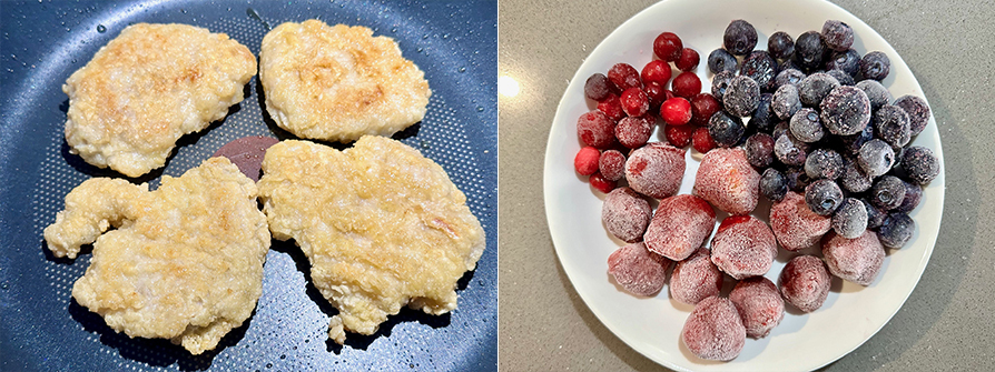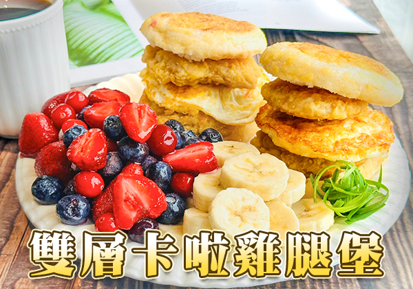 卡啦雞腿排4片、滿福堡2個、雞蛋2顆、天時冷凍草莓12顆、天時冷凍藍莓4大匙、天時冷凍蔓越莓1大匙、香蕉1根、酪梨油1小匙
