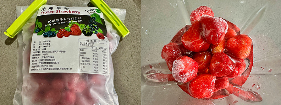 1.草莓,我習慣用逐批檢驗的冷凍草莓安心也方便,也沒有季節限制,用冷凍草莓做冰品不用再加冰塊很方便。