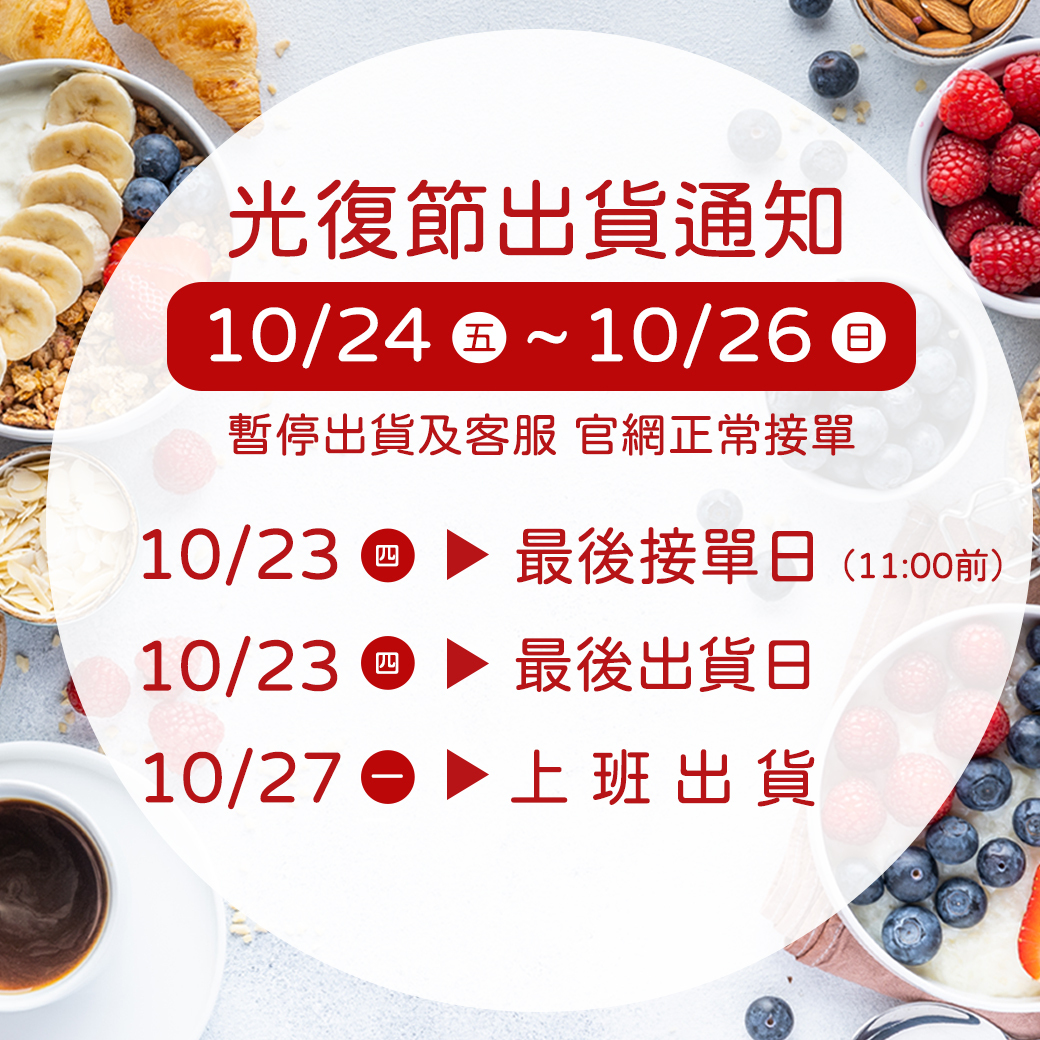 感謝大家的支持💚 10/24(五)~10/26(日)光復節連假期間 為配合宅配物流公休,暫停出貨、客服, 官網仍可正常下單.ᐟ.ᐟ • 連假結束後,我們將依照訂單順序陸續出貨。 📅 出貨重要時程請留意: ☻ 最後接單時間:10/23(四)上午 11:00 ☻ 最後出貨日:10/23(四) ☻ 恢復出貨時間:10/27(一)起 • 連假期間想吃到酸甜莓果的朋友🍓 記得一定要「提前下單」,才能準時收貨唷~