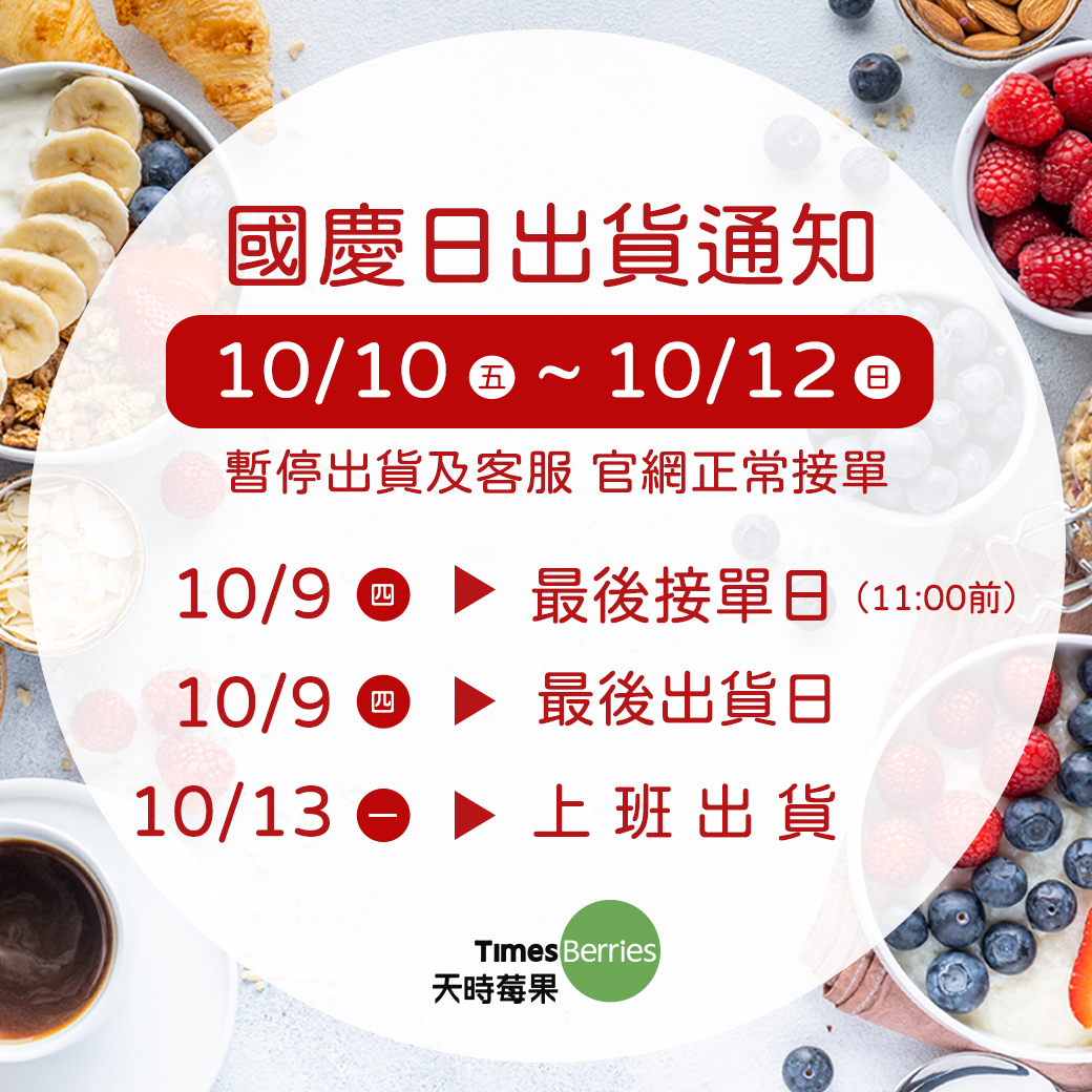 感謝大家的支持💛 10/10(五)~10/12(日)國慶連假期間 為配合宅配物流公休,暫停出貨、客服, 官網仍可正常下單。 連假結束後,我們將依照訂單順序陸續出貨。 📅 出貨重要時程請留意: ☻ 最後接單時間:10/9(四)上午 11:00 ☻ 最後出貨日:10/9(四) ☻ 恢復出貨時間:10/13(一)起 🎉 國慶連假不管你是想宅在家 🎇還是出門旅遊觀賞國慶煙火.ᐟ.ᐟ