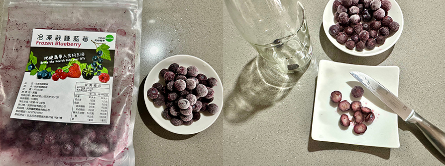2.今天想要純手工完成這道冰飲,冷凍藍莓用小刀每顆對半切。