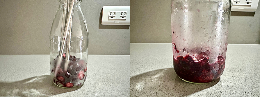 3.將對半切的藍莓,放進玻璃瓶中,用兩雙不鏽鋼筷,手握筷子開始戳戳戳。