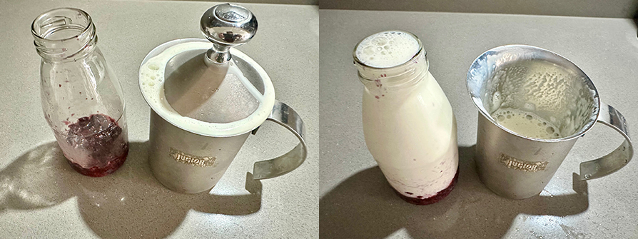 5.藍莓戳爛後再從冷藏取出鮮奶或豆漿倒進奶泡杯,將豆漿或鮮奶打成奶泡,這樣喝起來更綿密更好喝。