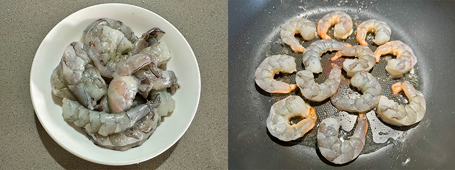 2.鍋小火加1/2大匙油,按下碼錶開始計時同時將蝦仁均勻擺好。