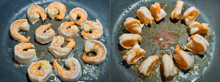4.再從第一隻翻面的蝦仁用筷子一一讓蝦仁剖開背立著煎,此時蝦仁已全熟,碼錶時間來到5分鐘時間,熄火,蝦球夾出。