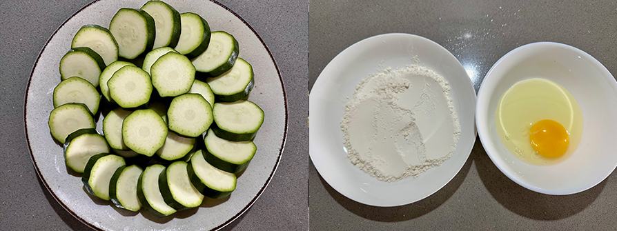 ●麵粉低中高筋都可,麵粉裝在平蹀上櫛瓜方便直接沾裹。